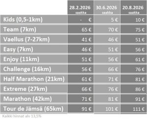 - Hyvät tuotepalkinnot kilpasarjojen parhaille(Challenge 16km, Extreme 27km, Marathon 42km, Tour de Jämsä 65km)