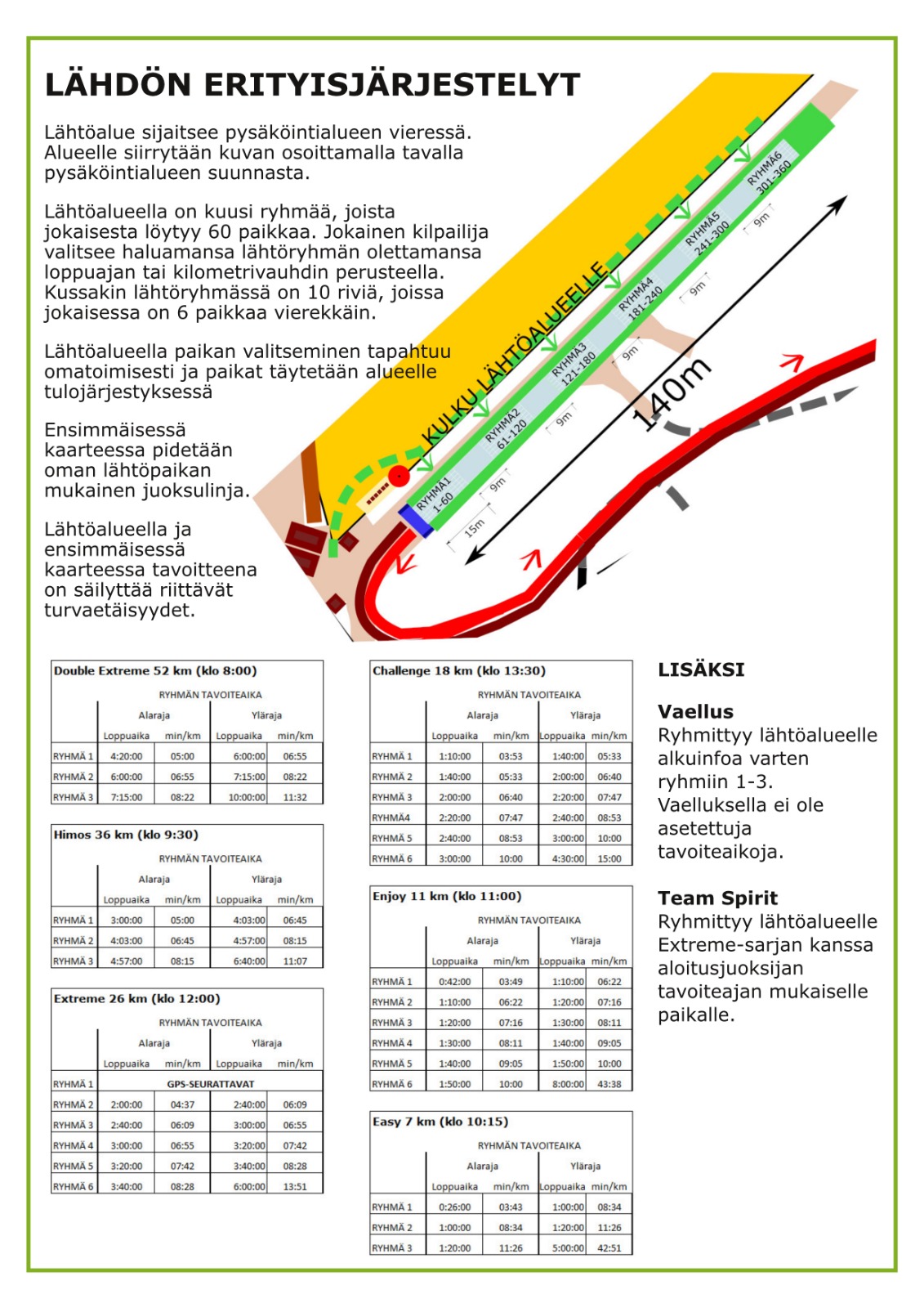 Huom! Jokainen Himos Trail -sarja on jaettu 3-6 lähtöryhmään, jotka kaikki lähtevät liikkeelle samaan aikaan. Lähtötilanteeseen väljyyttä ja turvavälejä luodaksemme olemme laatineet lähtöryhmät, jotka asettuvat lähtöviivalle tavoiteaikojen mukaan. Valitse jo ennen tapahtumaa oma lähtöryhmäsi, jotta osaat asettua oikeaan lohkoon lähtöalueella. Lähtöalueella oheiset lohkot ovat merkattu selkein kyltein.